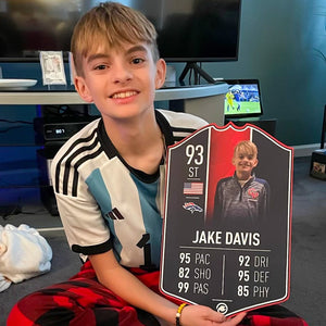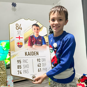 When it comes to personalising your card, the basic steps are to upload a photo and add a name to your card. Then you’ll add details like your player’s position and skill ratings out of 99 for each football skill shown on the card. Our online card builder makes this really easy. And if you aren’t a football card expert, don’t worry!